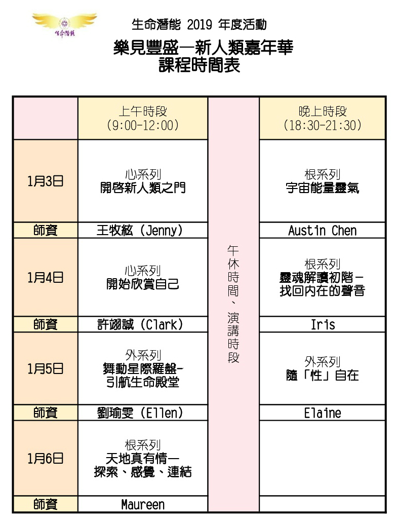 我們誠摯地邀請您,2019年1/3~1/6來參加「樂見豐盛-新人類嘉年華」,一起來體驗「新人類系統」帶來的豐盛與美好。