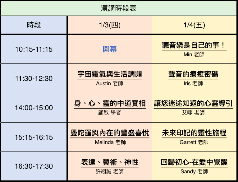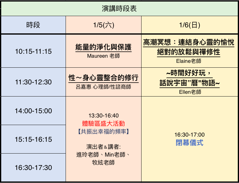 演講表演區(https://goo.gl/HNc75f):由專業人士教導大家如何善用高頻率的生活用品與飾品,提升自身頻率,保持平衡,維護健康。