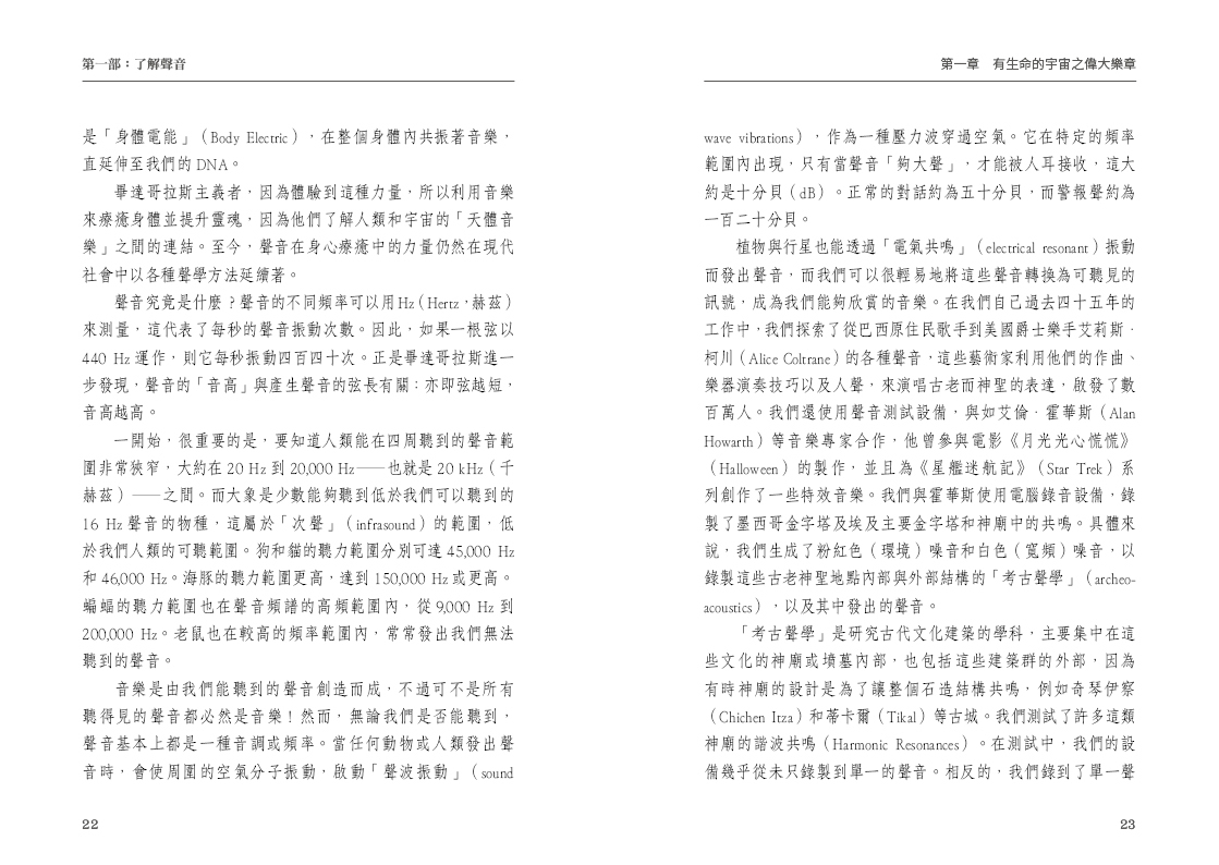 這本書也談到「雙耳節拍」、「528 Hz 愛的頻率」、「舒曼共振」,還有不同文化中關於神聖聲音的智慧,像是印度的種子音節(如OM)、脈輪系統、埃及神殿的聲學設計、藏傳佛教的頌缽與沙畫。